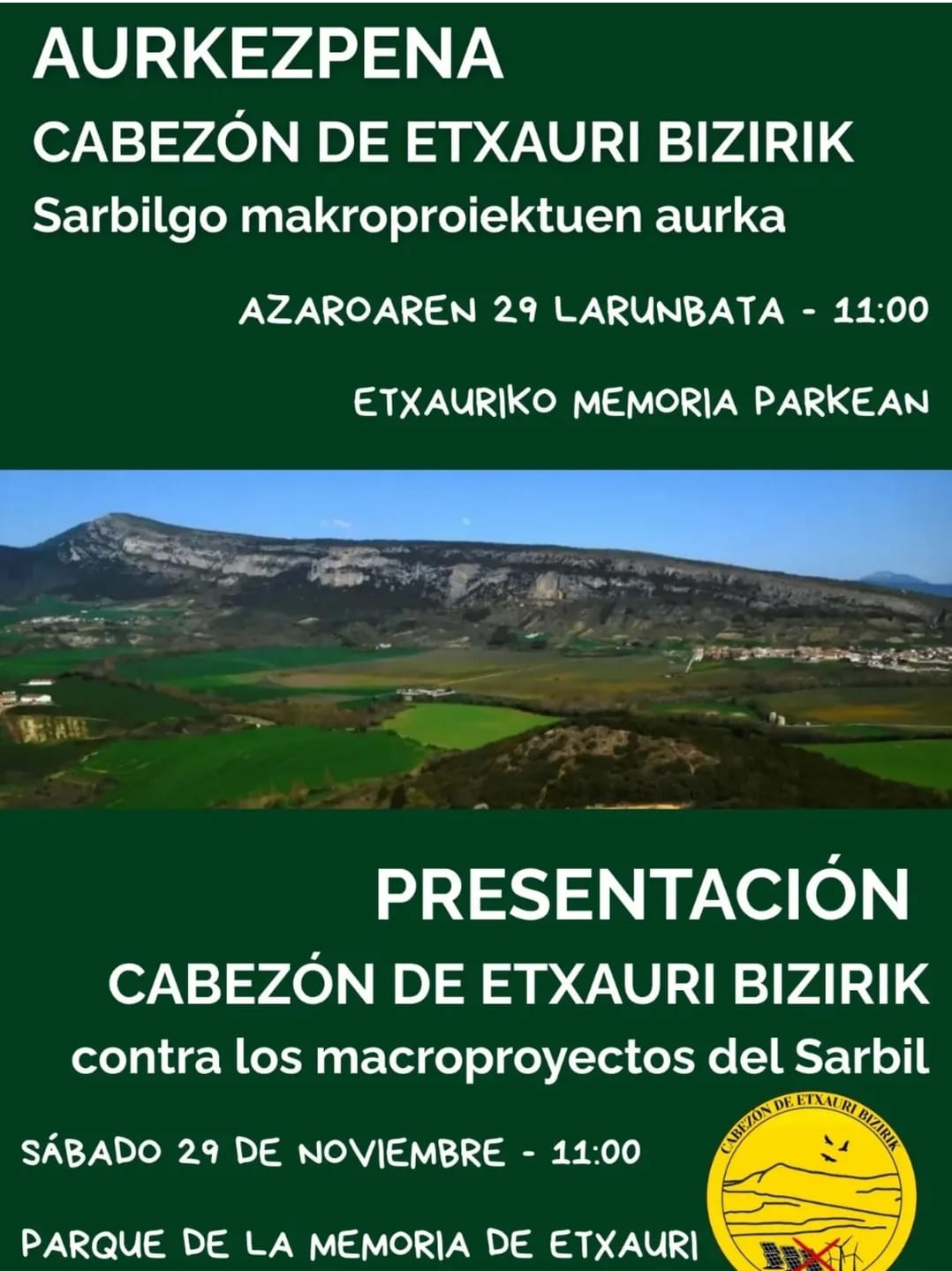 Horregatik, Sustrai Fundazioak datorren larunbatean, 11:00etan, Etxauriko memoriaren parkean parte hartzeko deia egin du, Etxauri Bizirik plataformaren aurkezpenean, Sarbileko makroproiektuen aurka.